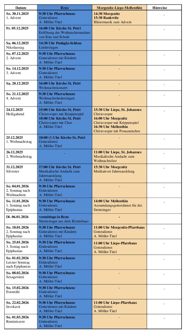Die aktuelle Gottesdiensttabelle für Benz sowie für Morgenitz-Liepe-Mellenthin als pdf-Datei in größerer Darstellung finden Sie ...hier.